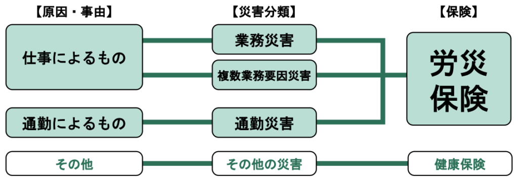 労災保険が適用される災害には、業務中に発生した業務災害、通勤途中に発生した通勤災害の2種類に分けられます。