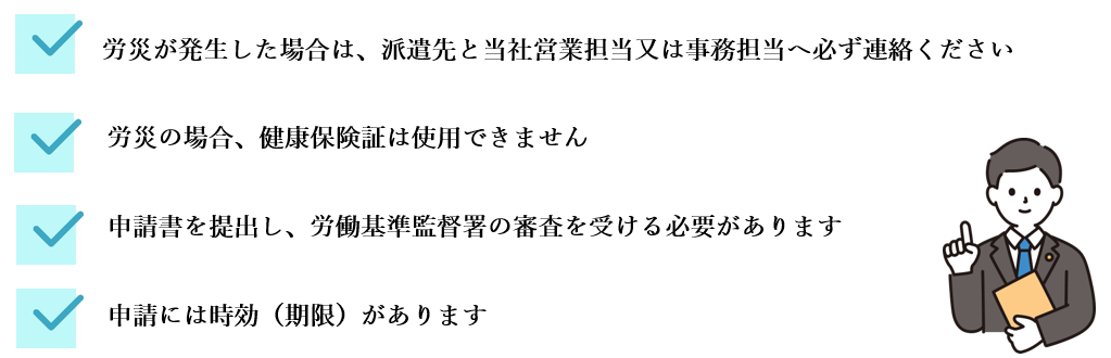 派遣先と当社へ必ず連絡ください。営業担当より「怪我をした日・その状況」「怪我の具合」「出社状況」をお伺いいたします。その後、営業担当より本ページのご案内と専用フォームより行う災害状況報告への回答方法をご案内いたします。