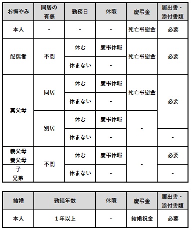 慶弔休暇につきましては、就業規則にて以下のように定めています。