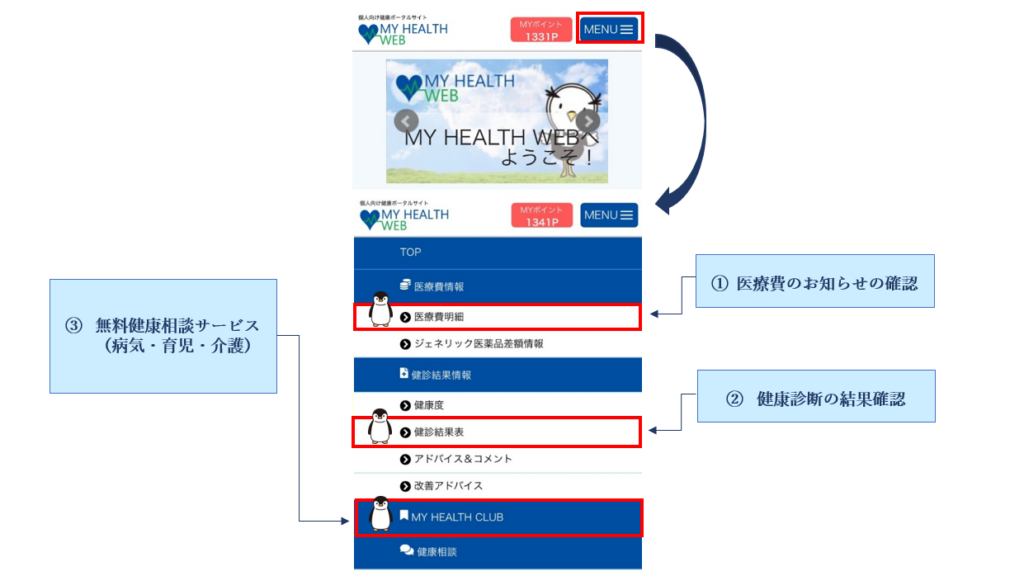 マイヘルスウェブでは、日常生活に役立つ情報や機関誌「すこやか」が閲覧できるほか、ご自身の健康情報(健診結果、医療費明細、お薬情報等)を個人が、PCやスマートフォンなどで、いつ、どこでも閲覧できるWEBサイトです。