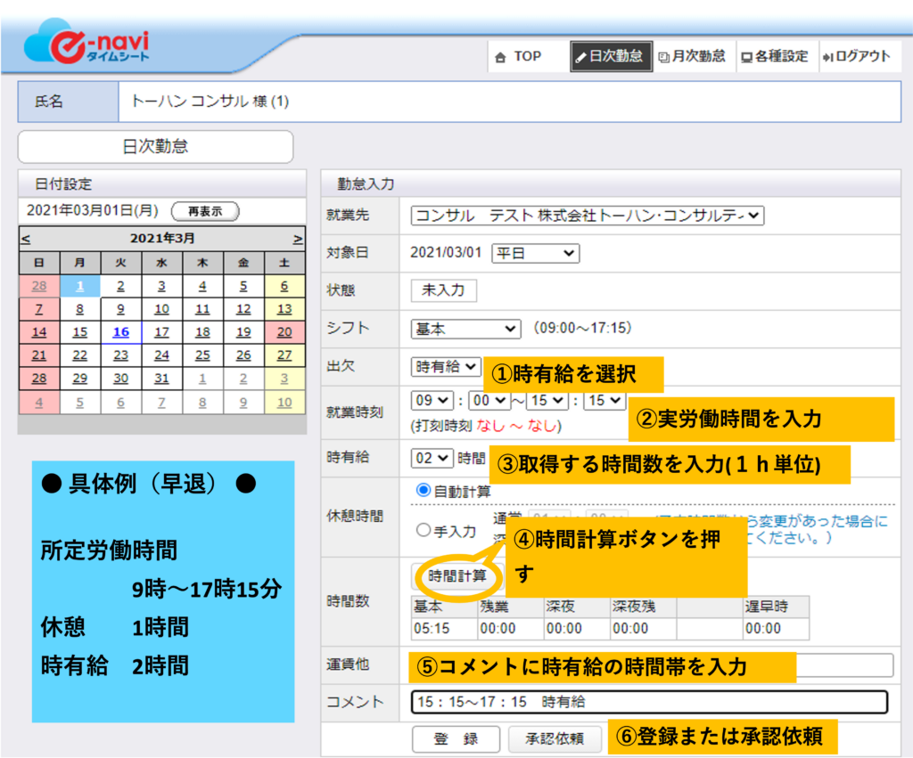 | 勤務時間9:00-17:15で →15:15に早退をする場合 | 実働 5時間15分(9:00-15:15/休けい1) 時有給 2時間(15:15-17:15) |