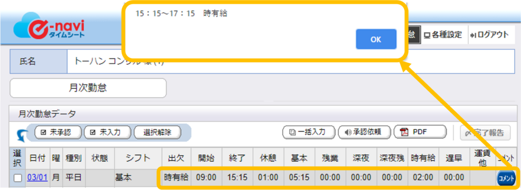 ※e-staffingのタイムシートは、備考欄に該当時間と時有給と入力