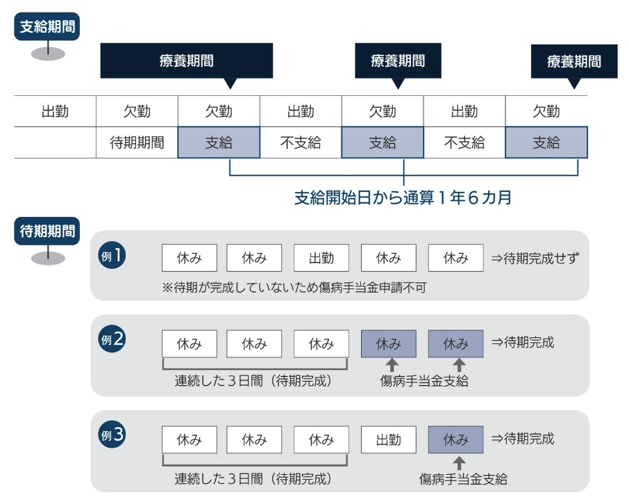 通勤途中や仕事中以外の病気やけがで療養のため仕事を休み、給与等が受けられない場合、その間の生活の安定を図るものとして支給される健康保険の給付です。傷病手当金が支給されるのは、続けて3日以上休んだ場合で、4日目から支給となります。最初の3日間は「待機期間」となり、支給されません。