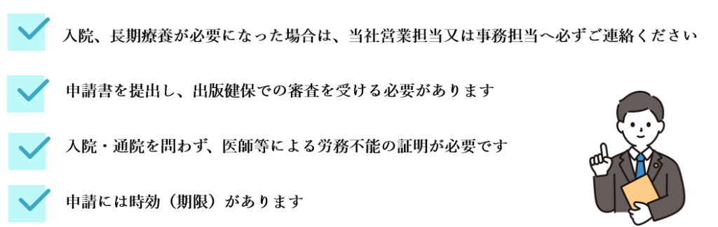 出版健保より審査通過の通知受領後、給付金をお支払いいたします。
