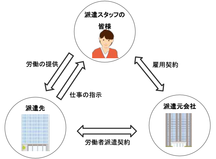 派遣スタッフと派遣元会社との間で雇用契約を結び、派遣元会社と派遣先との間で派遣契約が結ばれ、派遣スタッフは派遣先からの指揮命令を受けて労働力を提供いたします。
